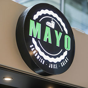 Vores sandwich og juice bar Mayo tilbyder lækre take away sandwich og salater, friskpressede juice, smagfulde smoothies og milkshakes der får smagsløgene til at synge. Har du brug for et lille hvil på shoppeturen, så slå vejen forbi Mayo til et måltid på farten, eller slå dig ned ved vores små caféborde.