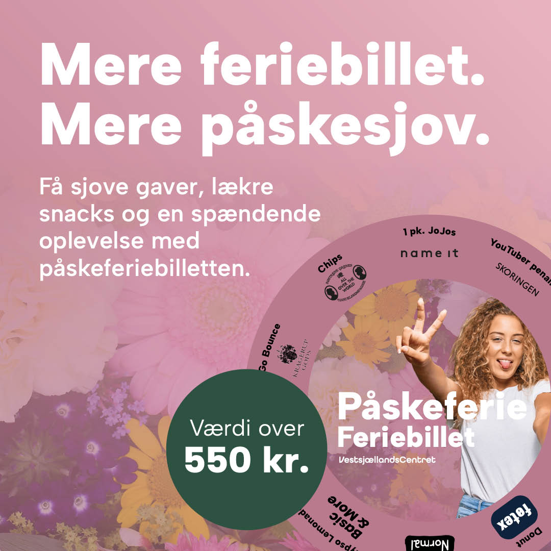 I VestsjællandsCentret tilbyder vi noget helt særligt til både tweens og børn i ferien: vores populære feriebilletter. Feriebilletterne giver tweens og børn en sjov og anderledes måde at opleve centret på – fyldt med gaver, aktiviteter og masser af feriehygge.